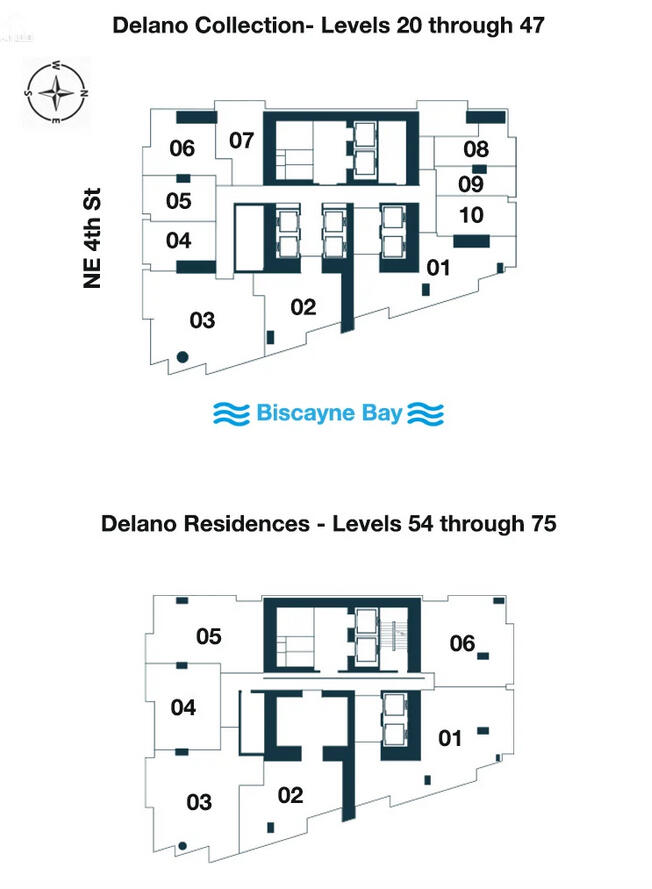 • D Collections from floor 20 to 47 - Fully finished & furnished* studios, 1, 2 bedrooms residences with 9.6 feet height ceilings• D Residences from floor 49 to 75 – Fully finished 1, 2 and 3 bedrooms with 10 feet height ceilings, including a deed office space• All residential interiors are designed by award-winning interior design firm Meyer Davis• Floor-to-ceiling windows with stunning views of city, and downtown skyline, Miami Beach, and the Atlantic Ocean• Fully built-out closets in all residences curated by Meyer Davis• Contemporary lighting package• Smart home technology oMers seamless personalization with the touch of a button